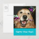Happy New Year! Send your best new year's greetings with this postcard, which features a cute golden retriever dog wearing a party hat and holding a noisemaker.