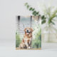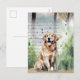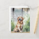 Carte postale présentant une illustration à l'aquarelle d'un golden retriever assis joyeusement au premier plan, la langue pendante, sur un fond mêlant arbres et verdure, avec des gouttes de pluie vertes à l'aquarelle créant un effet brumeux et rêveur. Un texte manuscrit cursif élégant superposé ajoute une touche vintage et nostalgique.