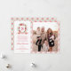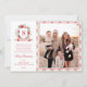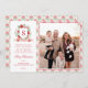 This Christmas photo card has a preppy grandmillennial design featuring a floral crest surrounded with berries an with a monogram letter in the center. The front and back have a coordinating damask pattern.