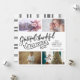 Photos de famille conception de collage Grateful, Thankful, Bienheureux conception de typographie cartes de fin de année de Noël. Ajoutez quatre de vos photos de famille préférées de l'année, votre salutation et votre nom de famille. Cette carte de Noël revient à un plaid noir et blanc sur le dos.