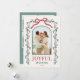 Partagez vos vœux de fin d'année les plus sincères avec notre élégante carte de vœux classique à photo. Le recto de cette belle carte présente une seule photo chérie nichée dans une forme de dôme/arc chic, encadrée par une guirlande d'arc traditionnelle en aquarelle et un nœud dans des couleurs festives rouge moyen et vert sauge. Un sentiment personnalisable d'un seul mot, tel que "joyeux", "joyeuse", "paix" ou "amour", ajoute une touche personnelle intemporelle, suivie de la signature de votre famille (par exemple, "Avec amour, les Miller") et de l'année. Le verso offre un espace généreux pour quatre photos carrées et votre message de mise à jour personnalisé, ce qui facilite le partage des moments forts de votre année. Cette carte de vœux personnalisée offre un moyen traditionnel et