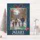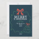 Modern hand-drawn red bow and green ribbon frame accented by a festive red bow and a mistletoe. With a classic "Merry Christmas" in classic typography on a modern teal blue background. Traditional red and green colors for that classic christmas vibe.