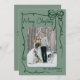 Send holiday cheer with this vertical Christmas card design. The front features a vertical photo in the center, framed by a swirling ribbon-style doodle border. A cute hand-drawn coquette bow sits in the top right corner, while “Merry Christmas” appears in a handwritten script at the top left. The bottom right includes space for your family’s last name or individual names, along with the year. The background is a soft sage green, with the doodle art and fonts in deep emerald green for a stylish and festive look. On the back, you can add a holiday note and sign from names, or leave it blank if you’d like to handwrite a personal message. Both sides have the same sage green background for a warm and cohesive feel. Available as a printed card or digital file, making it easy to mail, share online, or print locally.