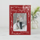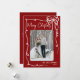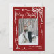 Send holiday cheer with this vertical Christmas card design. The front features a vertical photo in the center, framed by a swirling ribbon-style doodle border. A cute hand-drawn coquette bow sits in the top right corner, while “Merry Christmas” appears in a handwritten script at the top left. The bottom right includes space for your family’s last name or individual names, along with the year. The background is a dark maroon red, with the doodle art and fonts in white for a fun retro look.