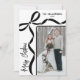 Send holiday cheer with this vertical Christmas card featuring a modern, slightly off-center layout. The photo sits in the bottom right corner, extending off the edge for a simple, contemporary look. A hand-drawn coquette bow rests in the top left, with ribbon lines running along the top and down the left side for a soft decorative touch. “Merry Christmas” appears vertically along the bottom left, adding a fun focal point. Your family name and date sit in the top right to keep things balanced. The background is white, and all fonts and artwork are black for a clean, minimal holiday feel. The back includes space for a short message or can be left blank if you prefer to handwrite your note. Available as a printed card or a digital file you can send or print anywhere.