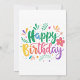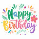 A vibrant and colorful birthday greeting card design featuring the words 'Happy Birthday' in playful, artistic fonts. The letters are adorned with various floral elements and cheerful decorations, including leaves and colorful dots, creating a festive atmosphere. The overall composition is lively and joyful, perfect for celebrating a special occasion.