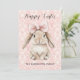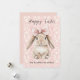This charming card, which is available as a download, features a charming young bunny with a huge pink satin bow. It says "Happy Easter" at the top, with a placeholder for your family's or organization's name below. You can easily edit either text field to personalize this card. The back is pink, with plenty of room to write a message if you want, or add your own photo on the back or leave blank. It's up to you!