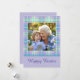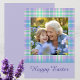 This beautiful Easter card showcases your photo with soft Easter blue, purple, and green plaid. Your photo should be basically square to fit in this space. The text "Happy Easter" appears in script below. The back of the card is a coordinating light purple.