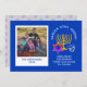 Stylish, elegant family photo card to celebrate HANUKKAH. Design shows a gold colored MENORAH with multicolored STAR OF DAVID and silver gray DREIDEL. At the top there is curved text which says BARUCH ATAH, ADONAI (Blessed are You, O God) and underneath the text reads HANUKKAH BLESSINGS FROM OUR HOME TO YOURS. On the reverse, there is a placeholder message, surrounded with a gold colored border. ALL TEXT IS CUSTOMIZABLE, so you can personalize with your own choice of greeting and text. With customization, eg. 'from our business to yours', this would also make a great corporate greeting card. You can also upload a family photo. The main color is Israeli blue. Other versions of this card are available in the HANUKKAH Collection by Berean Designs.
