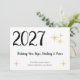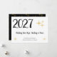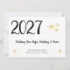 Happy New Year 2024 holiday card, with black script typographiy on a white background. With customizable lettering, you can add your own message. A gold snowflakes pattern accents the front of the card and covers the black background on the back. A great way to send your wishes of hope healing and peace in the new year.