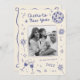 A quirky, hand-drawn New Year photo card with doodled fireworks, disco ball, stars and champagne glasses in blue.