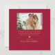 Elegant Happy New Year hand written Script Minimalist Burgundy and Gold 4 Photo Collage Holiday Card. This festive, minimalist, four (4) photo holiday card template features a pretty photo collage and says „Happy New Year”! The greeting text is written in a beautiful hand lettered swirly swash-tail Calligraphy font type in gold on burgundy deep red color background. On the reverse side with greeting text template, a little heart doodle and one horizontal photo template. Lovely greeting card for your family and friends in winter Holiday season.