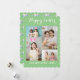 La carte a un arrière - plan vert pastel avec 4 collages photo et des textes blancs à l'avant. Vous pouvez customiser les photos et l'année du nom de famille en cliquant sur personnaliser l'option. Le dos est décoré de fleurs d'oeufs de Pâques.