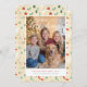 This cheerful, vertically-oriented holiday card showcases a warm family photograph centered within a unique, illustrated border. The background pattern combines classic seasonal motifs like holly and evergreen trees with enchanting elements from the Wizarding World, including wands, golden snitches, and flying letters. The photograph, which beautifully captures three smiling children and their dog in front of a glowing Christmas tree, is elegantly inscribed with the words "HOLIDAY Greetings." The bottom section of the card is personalized with the family name and the year, offering a magical and sweet way to share best wishes for the holidays.