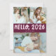 Whimsical and modern New Year's photo template card featuring a typography text that says "Hello, 2026" with 3 of your pictures. You can add another picture and a message on the back of the card. Cranberry color.