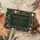 Préparez-vous à réserver la date pour une fête de Noël inoubliable avec notre magnifique carte de sauvegarde de fêtes de fin d'année. Ce design festif est orné de botaniques hivernales, de rubans et de boules, le tout posé sur une riche toile de fond vert foncé. Le cadre de coin de billet central vous permet de personnaliser les détails de votre événement, ce qui donne des cartes de sauvegarde élégantes qui reflètent parfaitement votre style unique. Ne manquez pas cette occasion de répandre la joie des fêtes de manière vraiment enchantante.