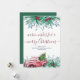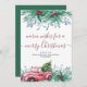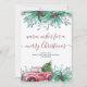 Elégante, simple et traditionnelle carte de vacances avec aquarelle design et typographie manuscrite. Le design est composé de plantes saints, de mistletoe, de branches de pin et d'un camion rouge vintage avec arbre de Noël décoré de lampes à cordes. Le modèle est configuré pour que vous puissiez ajouter votre signature et votre nom.