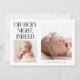 Welcome your little one to the world and share the joy of the season with our elegant Christmas birth announcement card with a little bit of humor. The text says "oh holy night, indeed." Featuring two adorable baby photos on the front and one on the back, this design combines modern minimal typography with festive charm. Personalize it with your baby’s name, birth date, weight, and length, plus a heartfelt thank-you message to friends and family. Perfect for sending holiday greetings while introducing your newest family member. Ideal for winter births, holiday baby showers, or as a keepsake for loved ones. Background is white.