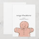 Cette carte de vacances présente un design minimaliste avec un thème ludique et joyeux. L'illustration centrale est une figure en pain d'épices de couleur brun clair, soulignée de lignes noires douces et décorée de détails en glaçage blanc, y compris des boutons, un nœud papillon et des motifs sur les bras. Le fond est propre et blanc, créant un look simple et élégant. Le design se concentre sur le charme festif tout en maintenant une esthétique moderne et épurée.