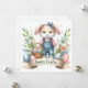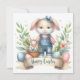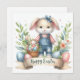 C'est une adorable illustration sur le thème de Pâques avec un mignon lapin habillé de couloirs en denim et une chemise rayée. Le lapin est accessoirisé avec un arc bleu sur la tête, ajoutant à son charme. Il abrite un petit panier en osier rempli d'oeufs colorés de Pâques. Autour du lapin se trouvent des fleurs de printemps, des feuilles verts et des oeufs de Pâques décorés plus gros. Sous le lapin, il y a une bannière avec les mots "Bonne Pâques" écrits en écriture élégante. Le style général est chaleureux, gai et parfait pour les fêtes de Pâques.