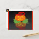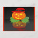 C'est une image d'un Jack-o'-lantern tout habillé. Un citrouille orange avec un casquette aux sorcières rouges est assis sur un lit de feuilles verts. La Jack-o'-lantern est éclairée par des yeux brillants et un sourire. Un fond noir a également été ajouté pour que vous puissiez voir sa réflexion. Ces cartes postales rendront tout le monde heureux de recevoir pendant les vacances.