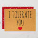 Je te tolère - Carte de Saint-Valentin sarcastique. Faites-lui savoir à quel point il est spécial avec cette carte de Saint-Valentin. Typographie tendance et un petit cœur doux sur le devant. - "Vous pouvez facilement modifier ou supprimer le texte externe et le modifier comme vous le souhaitez. en cliquant sur PERSONNALISER" -