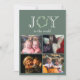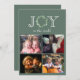 Typographie festive "Joie" au monde avec une couronne de faux eucalyptus pour la lettre "O". Ajoutez votre photo personnelle pour compléter cette carte de vacances. Ajoutez votre propre sentiment de vacances et vos noms au verso. Le motif sur le devant est repris au dos de cette carte.