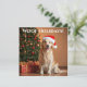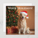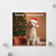 Une charmante carte de vœux de Noël mettant en vedette un golden retriever charmant portant un chapeau de Père Noël, rayonnant de joie des Fêtes tandis qu'il est assis à côté d'un arbre de Noël étincelant orné de décorations et de lumières. Les cadeaux emballés ajoutent une touche festive, créant une scène chaleureuse et fantaisiste.