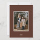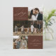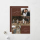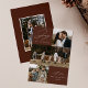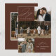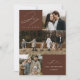 Carte de vacances moderne avec la phrase "Joie au monde" en élégante écriture blanche sur fond marron. Le devant du design présente 3 de vos photos de famille préférées disposées dans un style collage. Personnalisez le devant de la carte de Noël multi-photos avec le nom de votre famille et l'année. La carte se retourne pour afficher une photo supplémentaire.