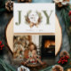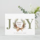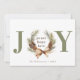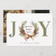 Un carte photo de vacances typographique avec JOY comme titre principal en vert et un cône de pin aquarelle et couronne d'arc faisant le "O" avec "l'amour de la paix" au centre. Personnalisez avec votre signature en vert et votre photo préférée au verso.