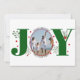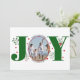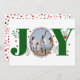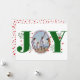 Green Joy with berries Photo de Noël Carte de vacances. Il montre le mot "JOY" avec des baies rouges et de la verdure tandis que au lieu de la lettre "O" il y a votre photo. Le dos comprend des pois rouges.