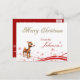 Le mignon Rudolf le renne à nez rouge sur un arrière - plan blanc avec un fond enneigé rouge. Elégant or et blanc Joyeux texte de Noël aussi bien. Design de Noël sympa et amusant pour vos cartes postales de voeux de Noël.
