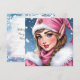 Carte de Noël personnalisée avec une illustration adorable d'une elfe féminine en rose avec de la neige tombant en arrière-plan. Au dos, vous pouvez personnaliser votre vœu de vacances.