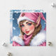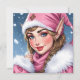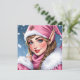 Carte de Noël personnalisée avec une illustration adorable d'une elfe féminine en rose avec de la neige tombant en arrière-plan. Au dos, vous pouvez personnaliser votre vœu de vacances.