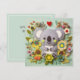 Cette carte de vœux Koala est parfaite pour toutes les occasions ! La carte présente un koala gris mignon entouré d'un ensemble coloré de fleurs et de feuilles, ce qui en fait un cadeau charmant pour vos proches. Le design ludique et les couleurs vives sont sûrs de faire sourire n'importe qui ! La carte est fabriquée avec des détails complexes, et le koala a de grandes oreilles rondes, des joues vertes et tient une fleur. Autour du koala, il y a un assortiment de fleurs et de feuilles colorées faites de divers matériaux qui leur donnent une apparence texturée. Il y a également de petits cœurs dispersés parmi les fleurs et les feuilles. L'ensemble de la composition du koala, des fleurs et des feuilles est posé sur un fond vert doux qui complète les couleurs des éléments.