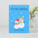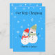 Carte de Noël Couple Snowman de Noël personnalisée avec vos Noms. Cette carte recto-verso est conçue avec un mignon Couple Snowman sur la couverture avant, entouré de flocons de neige sur un arrière - plan bleu doux. Le texte avant comprend : Notre premier Noël et vos premiers noms. Le texte inverse comprend : Votre message de Noël : Souhaitez-vous un très joyeux Noël et une bonne année, avec de l'espace pour signer vos noms en bas, sur un arrière - plan bleu doux assorti, avec deux casquettes de neige. Pour personnaliser cette carte de Noël, insérez simplement votre texte dans notre modèle facile, en remplaçant l'exemple. C'est rapide et facile !