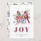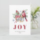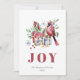 Cette carte de vacances confortable présente une aquarelle illustrant un cardinal rouge perché au-dessus d'une collection de cadeaux de Noël emballés dans un cadeau et entourée de verdure sainte et métisse et de flocons de neige bleus stylisés. Le mot "JOY" apparaît dans de grandes lettres rouges et muettes qui s'harmonisent avec l'art. Ajoutez le nom de votre famille et l'année en italique gris-fusain. Le dos de la carte est muni d'un motif de coordination d'oiseaux aquarelles et d'autres motifs de vacances.