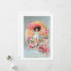 Adorable petite fille victorienne avec des boucles sombres dans la grenouille jaune et la pingle blanche assise sur une clôture en pierre entourée de fleurs de cerisiers roses. Elle est dans un cadre doré perlé avec un arrière - plan gris/bleu pastel et un verset Valentin or.