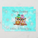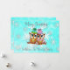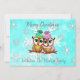 Carte de Noël avec deux hiboux se blottissant sur une branche avec un joli fond de flocons de neige bleu sarcelle et blanc. Ajoutez vos noms et votre message personnalisé dans la zone de personnalisation.