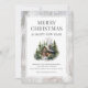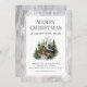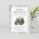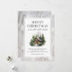 Carte de vacances rustique aquarelle avec un cabine en rondins à l'intérieur d'un cadre en bois rustique orné de flocons de neige. Personnalisez facilement cette carte de vacances enneigée avec votre nom de famille et votre texte.