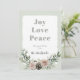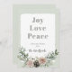 Christmas Roses and Pine Cones Joy Love Peace Motivational Quote Holiday Card... Overlaid on a background of delicate pastel green is a classic vintage deckled edge white text frame containing your holiday greeting and the motivational quote --- "Joy Love Peace" --- above a bouquet of pink roses, pine cones, and Christmas botanicals. A lovely holiday message for family and friends alike. All text can be revised with your own words on the personalization template (or delete if you prefer to hand write).
