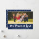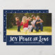 Le design horizontal des cartes photos de vacances présente une couleur bleu marine arrière - plan (peut être customisé) et un style élégant "Joy Peace and Love" en écriture de script brossée. Personnalisez l'accueil personnalisé avec votre texte préféré et ajoutez votre photo de paysage préférée (l'espace image est de 3,5 x 7 pouces). Un motif de points blancs enneigés apparaît à l'arrière de la carte. Photographie © Storytree Studios, Stanford, CA