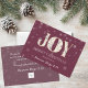 Faites une impression durable avec la Joy Red Business Holiday Card. Cette carte moderne et minimaliste, avec feuillage hivernal dans "JOY", peut être customisée avec votre logo et message d'entreprise, ce qui en fait l'idéal pour les salutations de vacances d'entreprise.