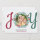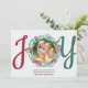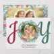 Carte photo de Noël personnalisée, personnalisée avec vos propres photos sur le devant et le dos, ainsi que votre message et votre(s) nom(s). Le devant de la photo porte le mot JOY en écriture rouge et vert muet, en utilisant votre photo, encadré d'une couronne festive comme lettre 'O'. Sur le dos, votre photo est encadrée d'une bordure de feuillage d'hiver. Les illustrations d'aquarelle comprennent les cônes de pin, les fleurs, le houx, la verdure et les baies de forêt. Parcourez mon magasin pour coordonner les articles, les cadeaux et la décoration de maison.