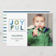 Ce design carte photo de vacances moderne et minimaliste présente un design simple encadré "JOYFUL" en lettres sans serif, dans des tons cool bleu et vert. Personnalisez avec votre photo de portrait préférée, votre famille et l'année. Le motif de coordination de bandes horizontales colorées habille le dos de la carte. Les couleurs comprennent : bleu cobalt, olive, bleu acier, gris chasseur, bleu aqua, indigo, et des accents de gris foncé.