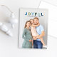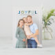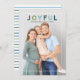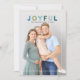 Ce design carte photo de vacances moderne et minimaliste est doté d'un cadre photo simple avec une superposition "JOYFUL" en lettrage sans serif moderne qui est stylisé dans les couleurs cool bleu et vert. Personnalisez avec votre photo de portrait préférée (5 x 7), les noms des membres de votre famille et l'année. Le motif de coordination de bandes horizontales colorées habille le dos de la carte. Les couleurs comprennent : bleu cobalt, olive, bleu acier, gris chasseur, bleu aqua, indigo, et des accents de gris foncé.
