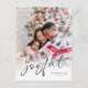 Joyeux Photo de famille superposition Calligraphie Noel Blanc. Remplacez simplement l'exemple de photo par le vôtre et personnalisez avec vos noms et votre année. Joyful est dans un jeu élégant script set en vert foncé qui peut être changé à une autre couleur si vous le souhaitez.