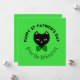 Ce design représente un chat noir avec un nœud papillon, sur fond vert, avec un texte qui dit "Joyeuse Saint-Patrick", et le nom de la famille. Au dos, il y a un espace pour un message qui dit "Passez une joyeuse Saint-Patrick!", avec un trèfle décoratif.