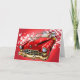 Illustration géniale du Père Noël portant des cadeaux dans une Cadillac vintage rouge magique avec un ornement de capot de canne doré ! Super carte pour papa ou n'importe quel fan de voitures.