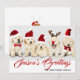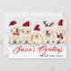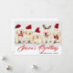 Cette création pour les fêtes comporte une photo de deux chiots Golden Retriever portant des chapeaux de Noël rouges et le texte "Meilleurs Vœux" écrit dans une typographie rouge populaire avec un nom de famille ajouté en dessous. Le verso de la carte comporte un dessin animé de renne festif. Pour personnaliser, vous pouvez ajouter votre propre photo et modifier le texte.
